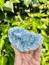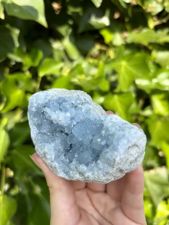 Een handzaam stuk celestien met zachtblauwe kristallen en een open kern. De kristallen zijn helder en glinsteren mooi in het licht. Fijn formaat voor op een nachtkastje, in de woonkamer of op je bureau.