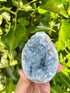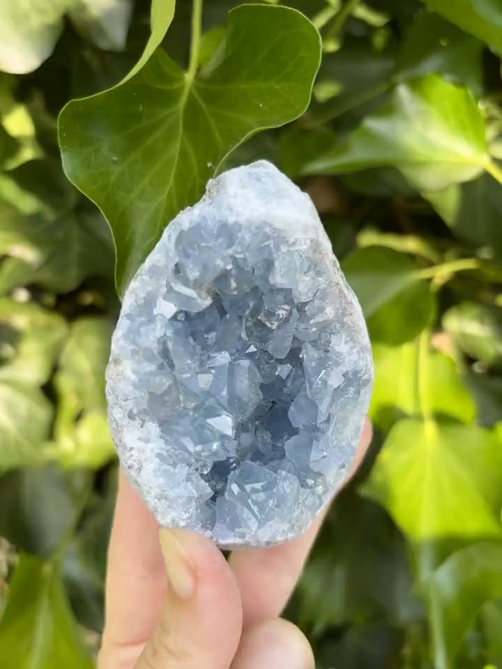 Een handzaam stuk celestien met zachtblauwe kristallen en een open kern. De kristallen zijn helder en glinsteren mooi in het licht. Fijn formaat voor op een nachtkastje, in de woonkamer of op je bureau.