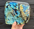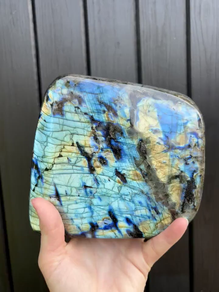Dit labradoriet pronkstuk van 2550 gram is volledig gepolijst, zowel aan de voorzijde als aan de achterkant. De steen laat een schitterend kleurenspel zien dat varieert van blauw en turquoise tot gouden vlakken die oplichten zodra je hem beweegt.
