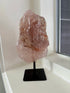 Dit stuk rozenkwarts uit Brazilië valt op door de zachte roze kleur met subtiele insluitsels van hematiet. Deze geven het kristal een extra diepte en een warme gloed. Op standaard komt de steen mooi tot zijn recht en is het een stijlvolle toevoeging aan ieder interieur.