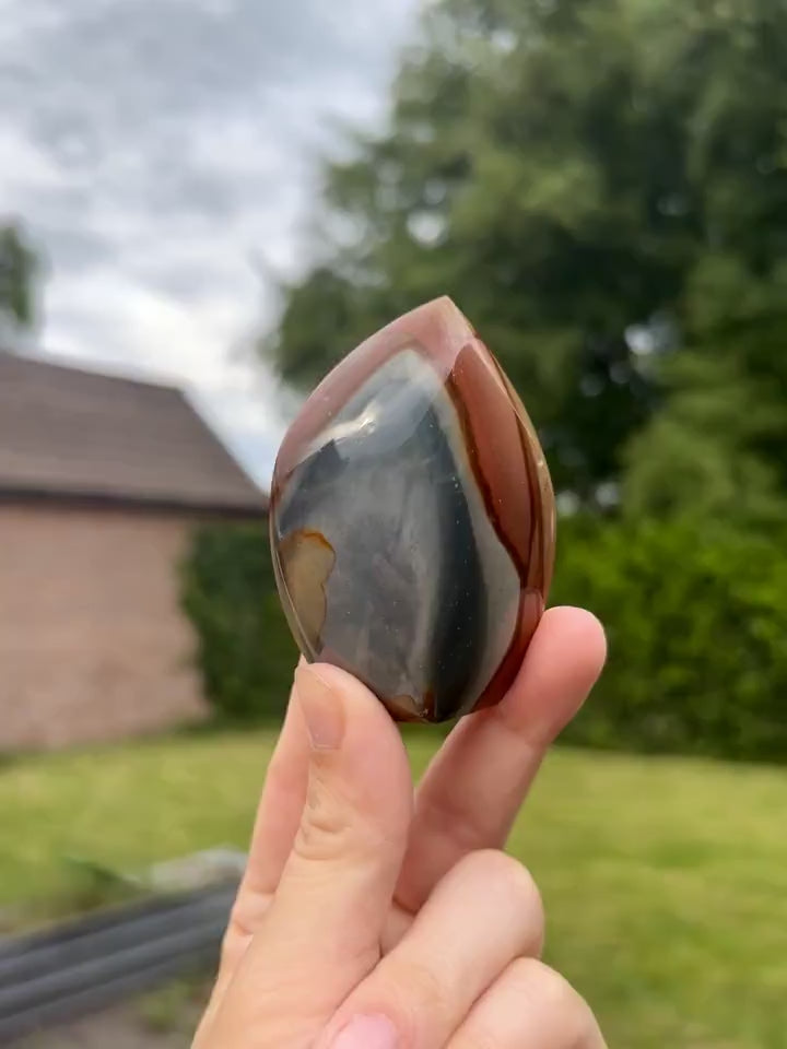 Polychroom jaspis ontstaat in lagen van vulkanisch gesteente. Door de invloed van druk, tijd en mineralen ontstaat een uniek patroon dat in elke steen zijn eigen verhaal vertelt.